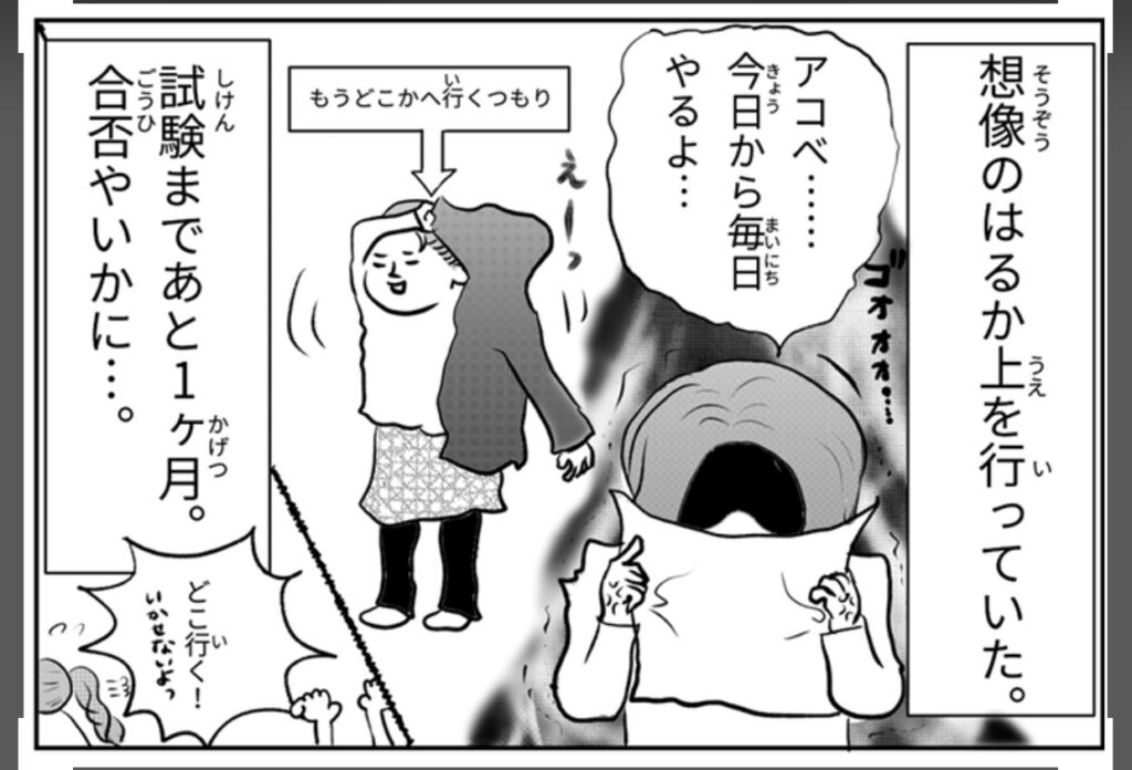 翌朝学校行く前に母にガミガミ言われながら宿題をする、