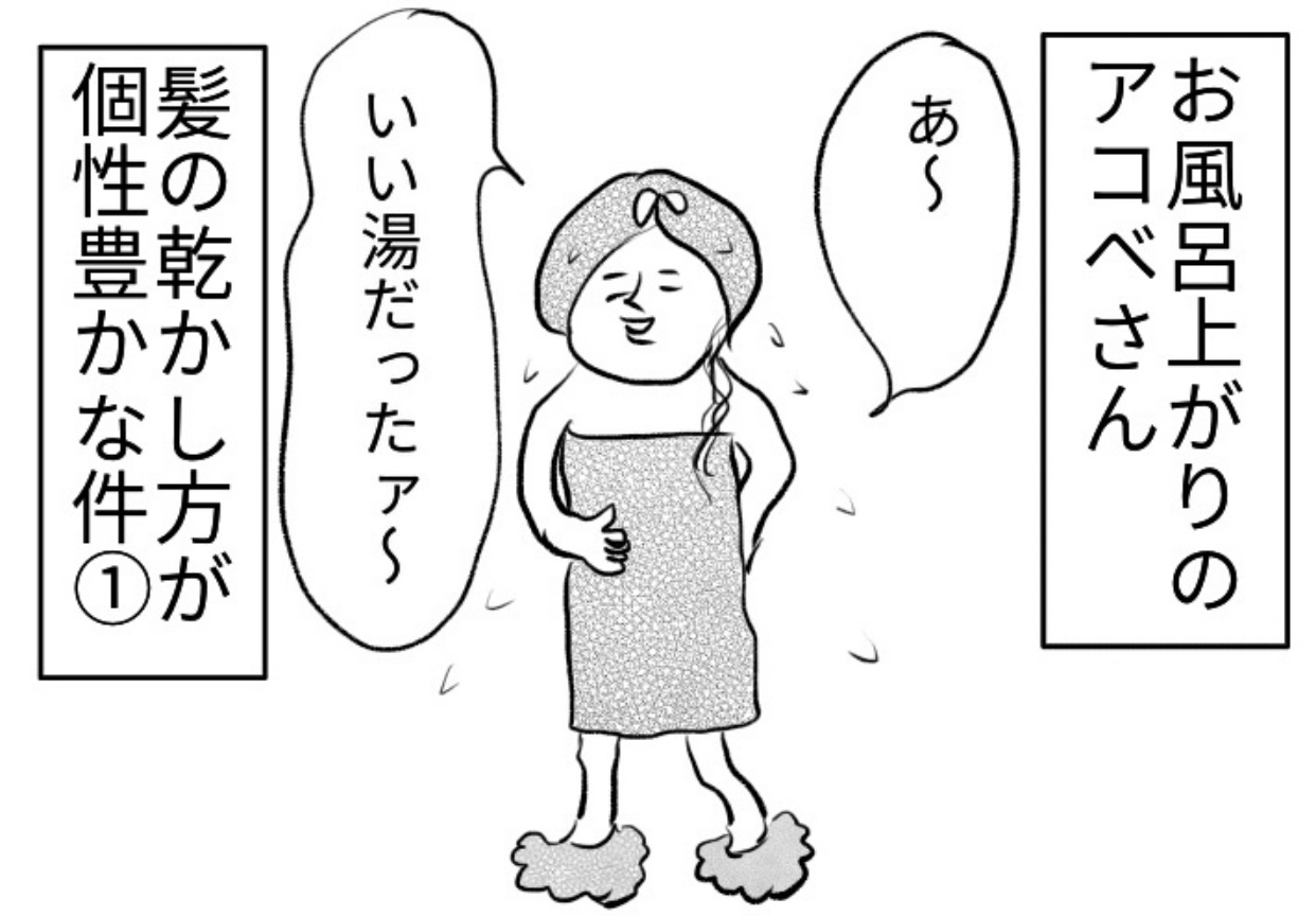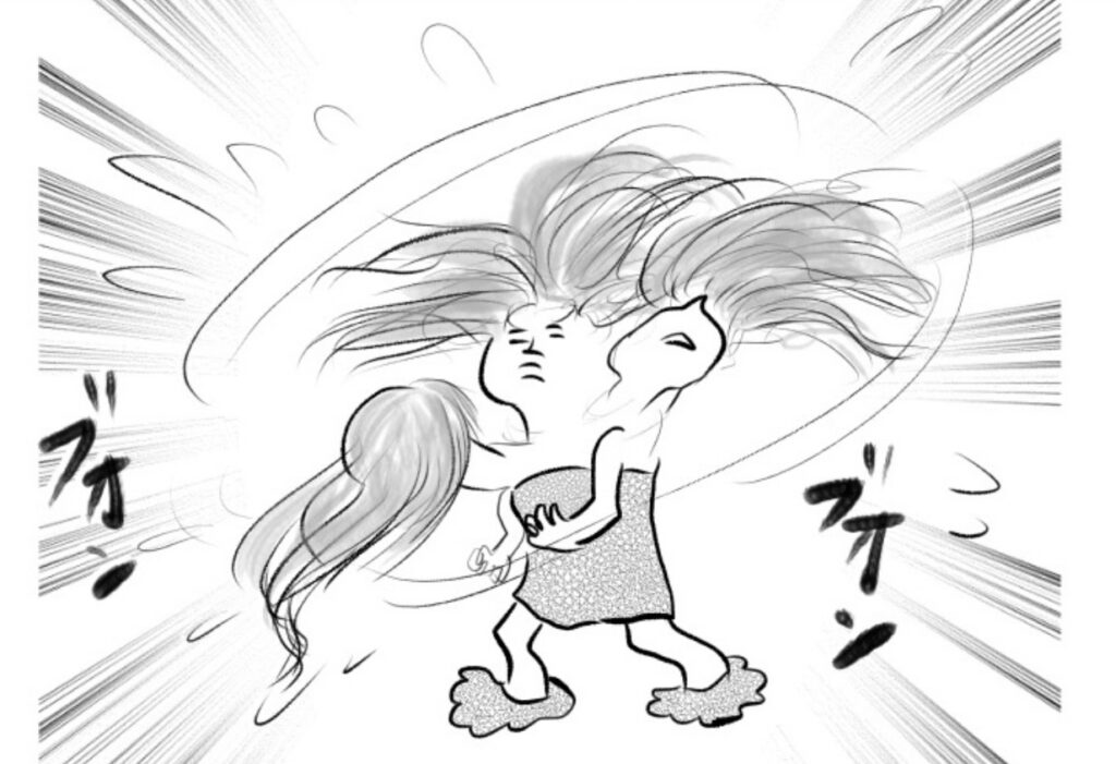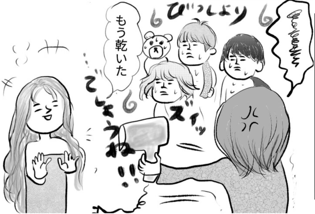 秘技!連獅子の舞を披露するも・・周りはぐっしょり・・怒られてしょんぼり(涙)9歳長女の個性豊かなヘアドライ法|アルある子の育児漫画